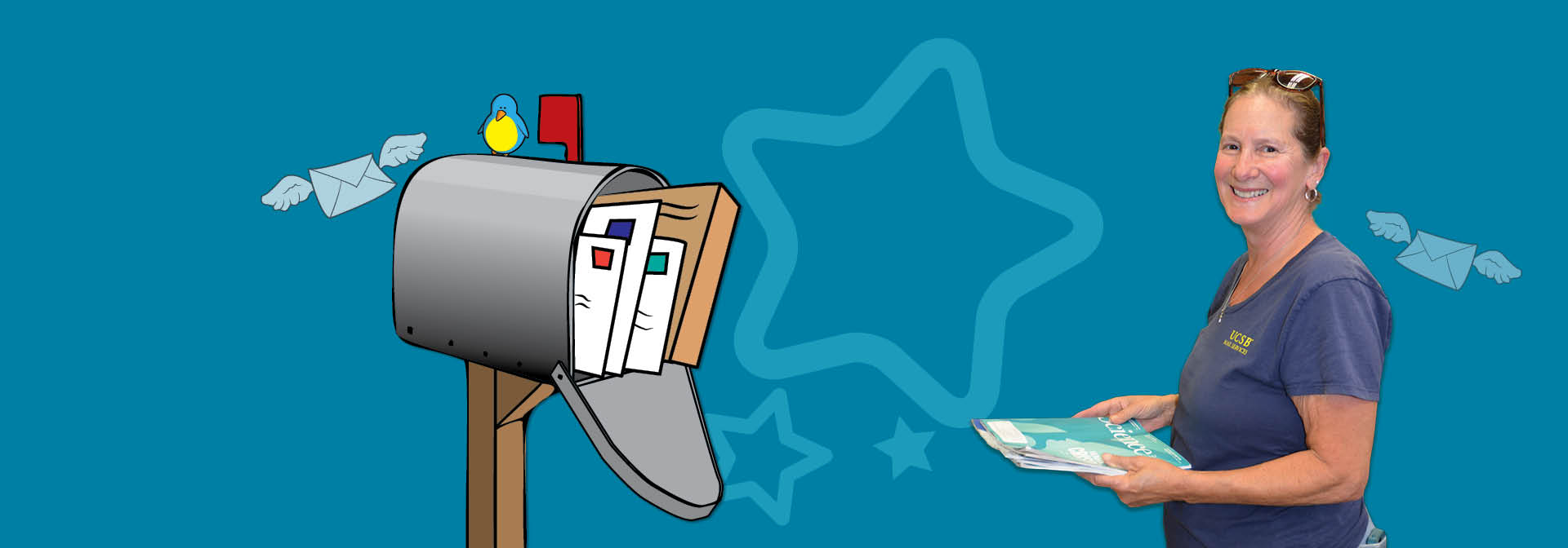 [Image Description: Toni Murrillo gets a little carried away when it comes to sorting mail at Central Mail Services.]